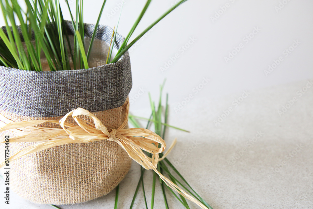 Fili d'erba, in sacchetto di juta con nastro di rafia, isolato su fondo chiaro; dettaglio