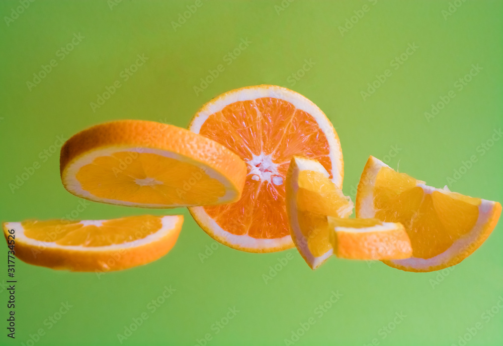 Green bright background and pieces of orange in air. Healthy and useful nutrition. Fruit and citrus. Vitamin C. Diet.