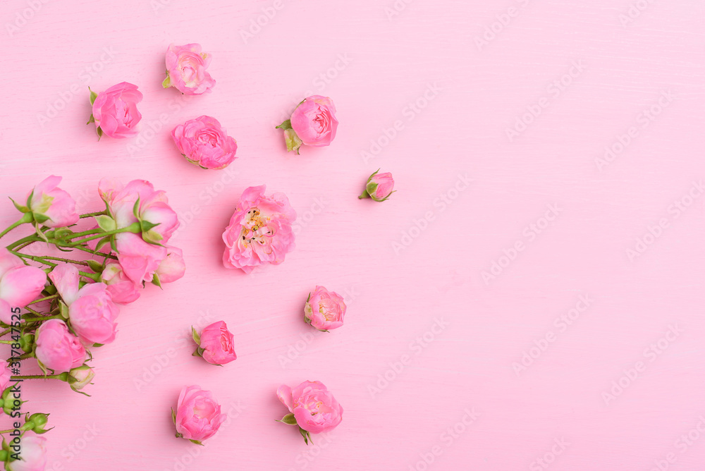Beautiful pink roses blooming on pink background with copy space