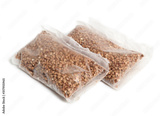 Boil in bag buckwheat groats in polythene sachets (plastic bag). Isolated on a white background.