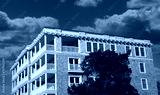 A large wood shingled beach house with balconies and a tree against a blue sky