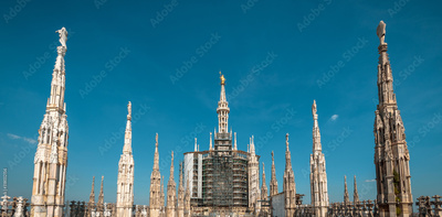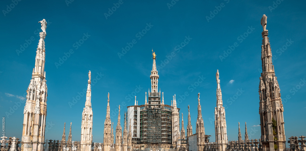 Milan Cathedral roof, Italy. Famous Milan Cathedral or Duomo di Milano is top landmark of city. Panoramic view of luxury spires and statues, Madonna in center.