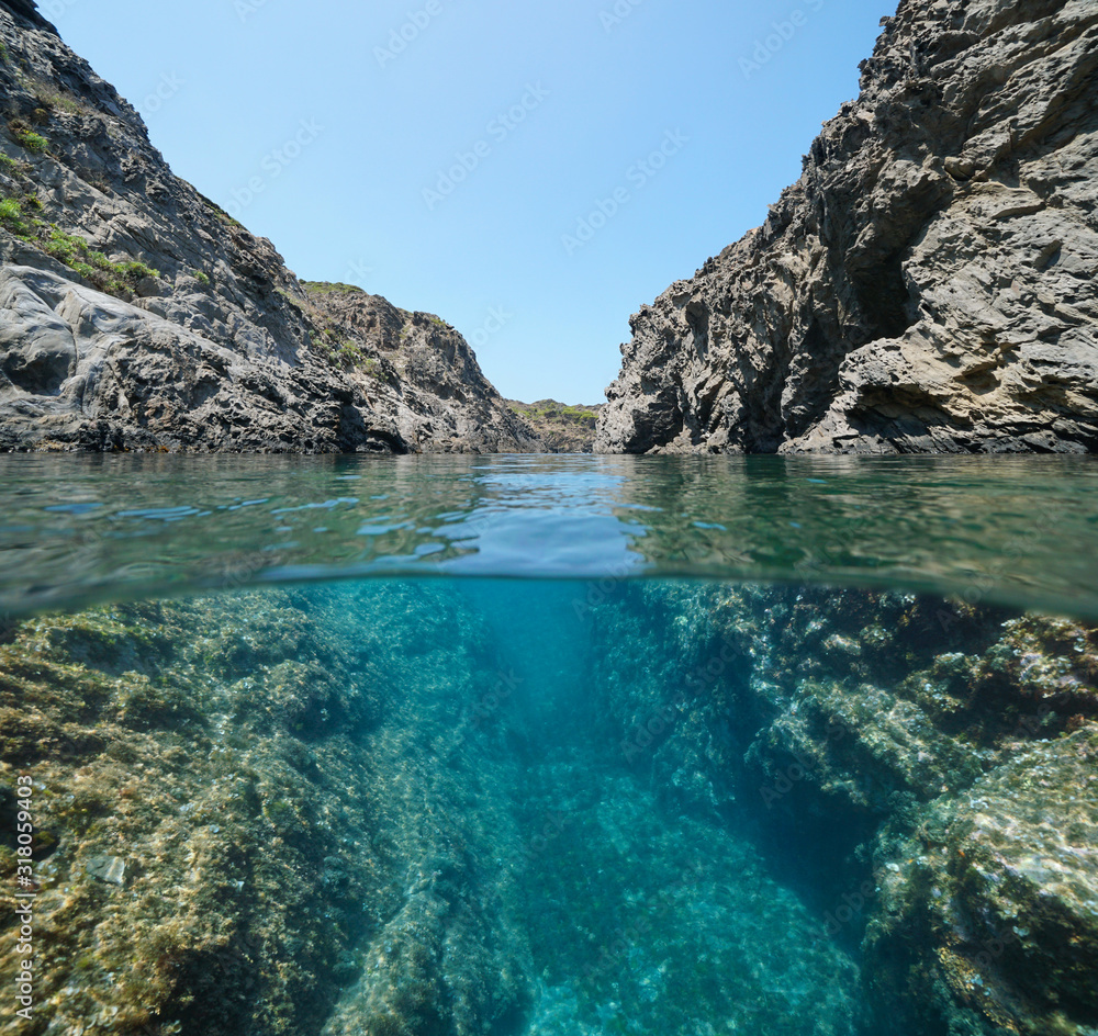 Mediterranean sea rocky coast with a passage between rocks, split view over and under water surface, Spain, Costa Brava, Catalonia, Cap de Creus