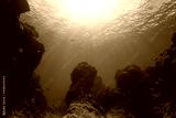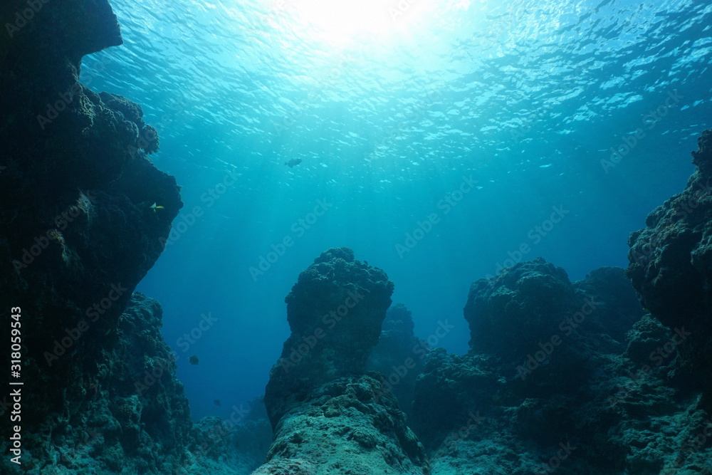 Underwater seascape, rocky reef on the ocean floor with sunshine through water surface, natural scene, Pacific ocean, French Polynesia