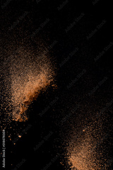 Cocoa powder explosion in motion on black background. Chocolate dust.