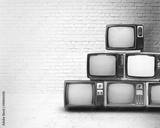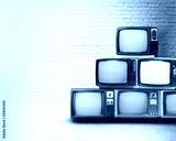 Retro televisions pile on floor in old room with white wall. Antique and vintage home decoration style.