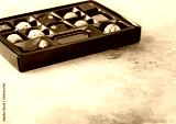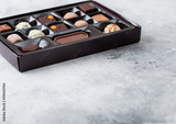 Box of Luxury Chocolate candies selection on light background. White, dark and milk chocolate assortment.