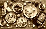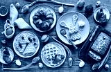 Easter festive dessert table with various of cakes, waffles, sweets and strawberry. Overhead view