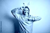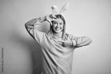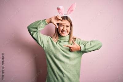 Young beautiful woman wearing easter rabbit ears standing over isolated pink background smiling making frame with hands and fingers with happy face. Creativity and photography concept.