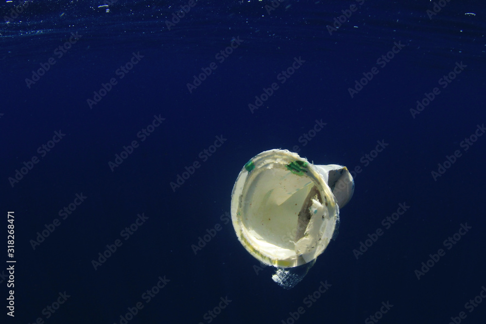 Plastic cup drifting in ocean. Underwater plastic pollution