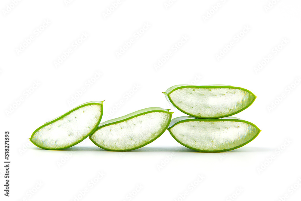 Fresh aloe vera leaves and slices on wooden table for Health products.
