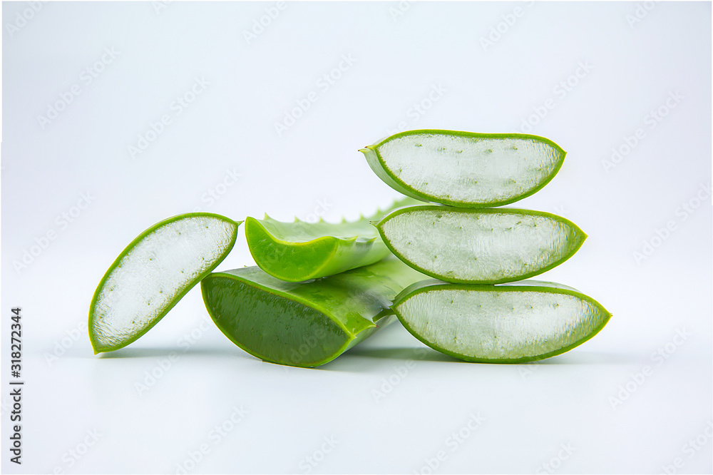 Fresh aloe vera leaves and slices on wooden table for Health products.