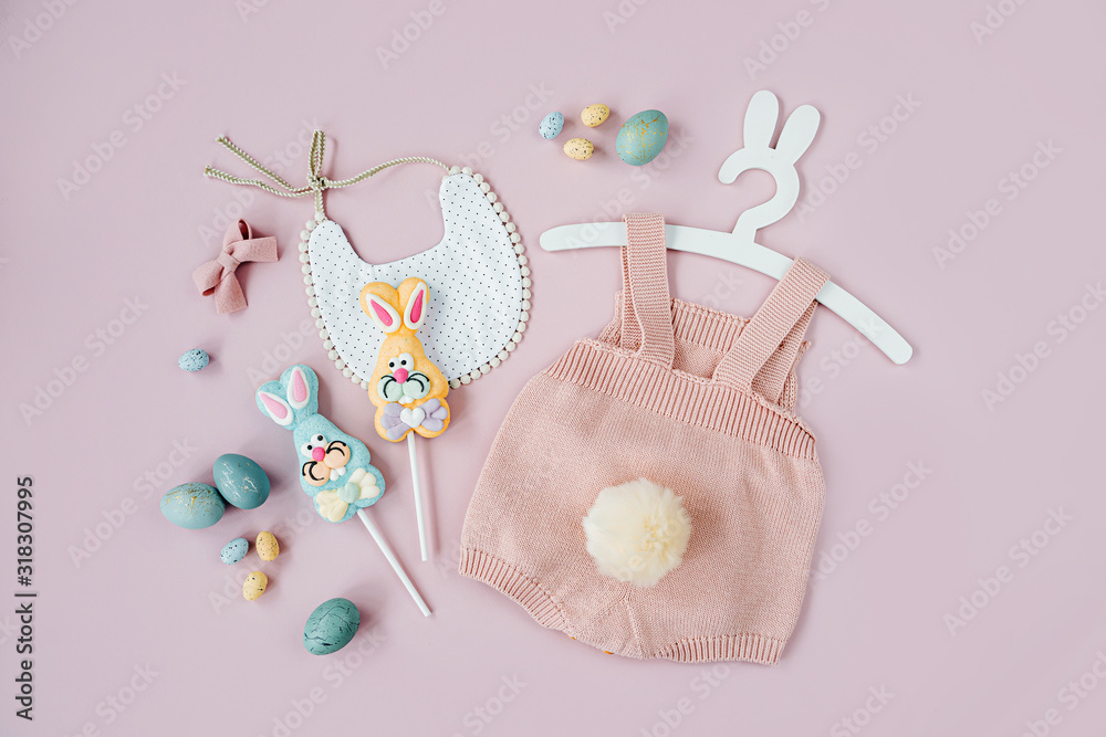 Cute baby costume Easter bunny. Knitted bodysuit with fluffy tail bunny, Easter eggs and candy on pink background. Holiday concept. Flat lay, top view