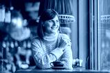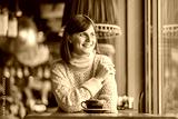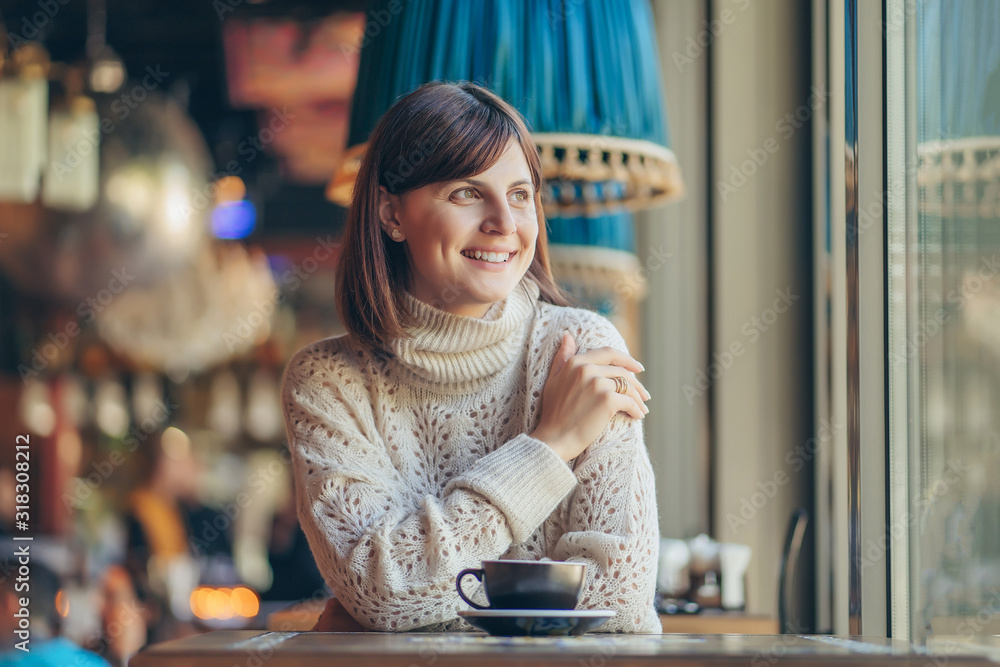Beautiful young woman in warm sweater in the cafe near the window with coffee. Cozy autumn or winter morning.