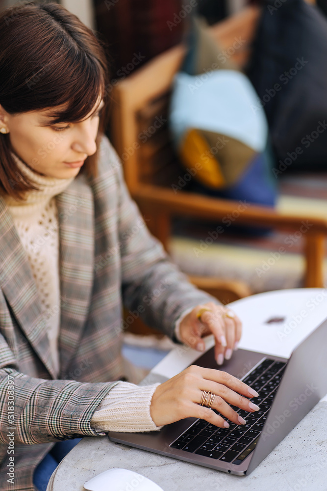 Close up image of woman hands typing and writing on laptop, working on cafe.