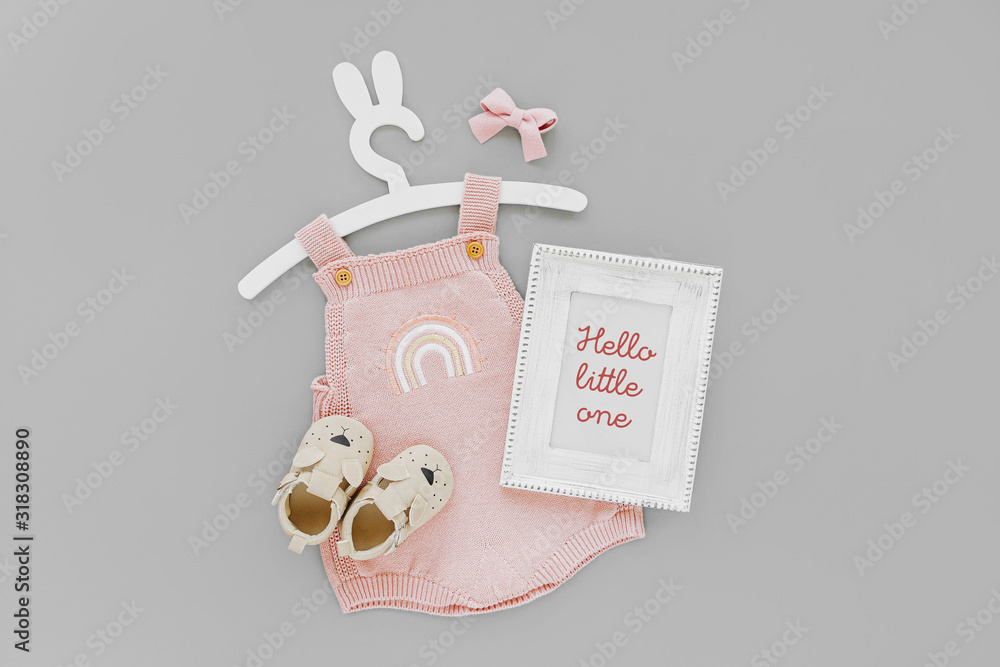 Pink knitted bodysuit on cute hanger with bunny ears with photo frame and baby boots. Set of kids clothes and accessories summer. Fashion newborn. Flat lay, top view