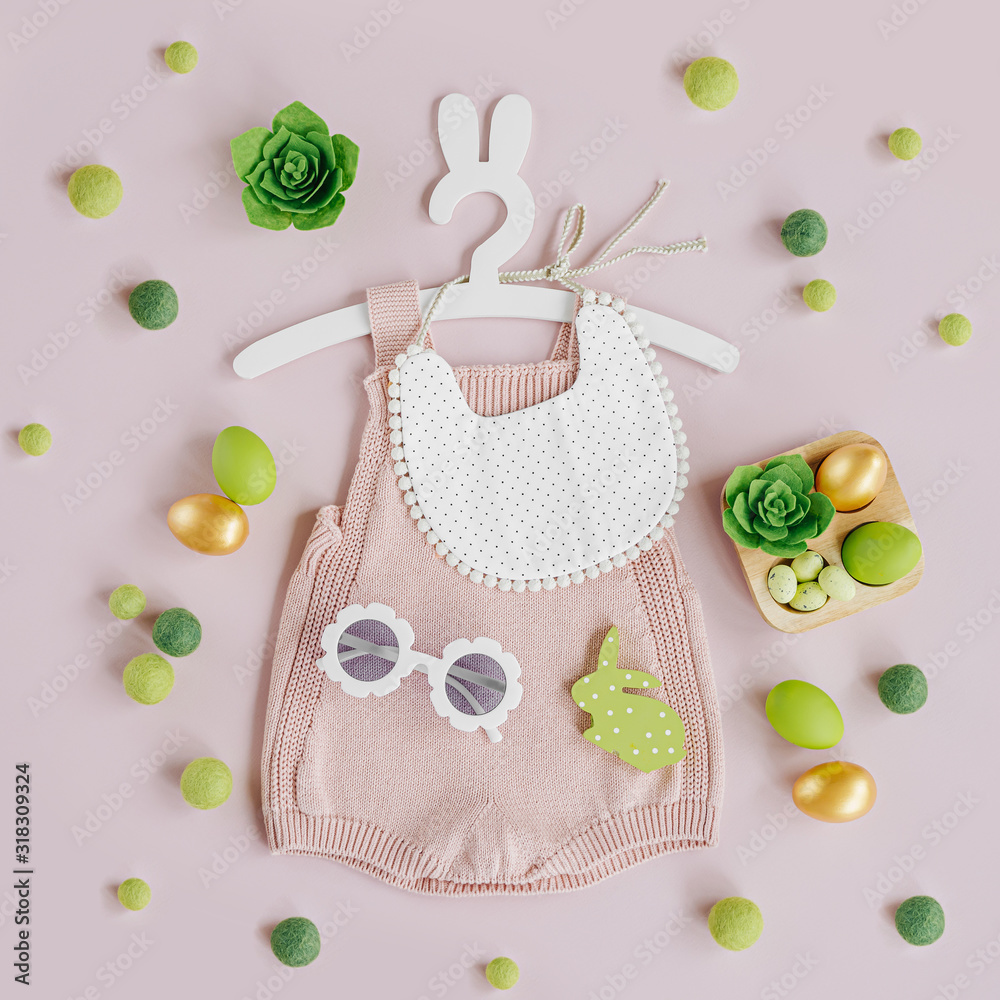 Spring baby clothes. Knitted bodysuit on cute hanger with bunny ears with Easter decorations and eggs on pale pink background. Holiday concept. Flat lay, top view