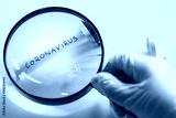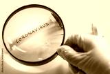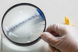 Coronovirus vial under a magnifying glass, The concept of research and finding a cure for a dangerous virus