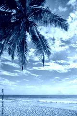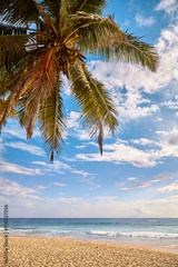 Tropical beach with coconut palm tree at sunset.