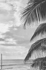 Palm tree leaves at sunset with seascape in background, selective focus, color toning applied.