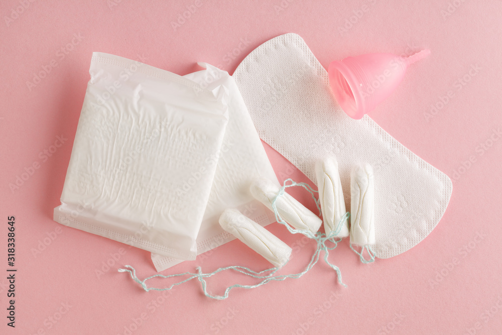 menstruation cycle, feminine hygiene and protection products, sanitary pads, tampons and menstrual cup on pastel pink background, top view, flat layout