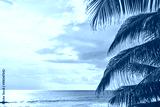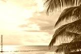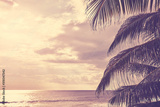 Palm tree leaves at sunset with seascape in background, selective focus, color toning applied.