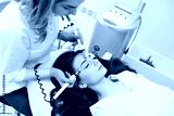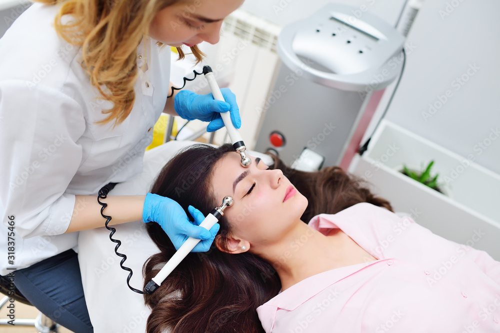 facial skin rejuvenation by microcurrent therapy in a modern cosmetology clinic. A cosmetologist uses a special device to perform a facial rejuvenation procedure for a pretty young girl.