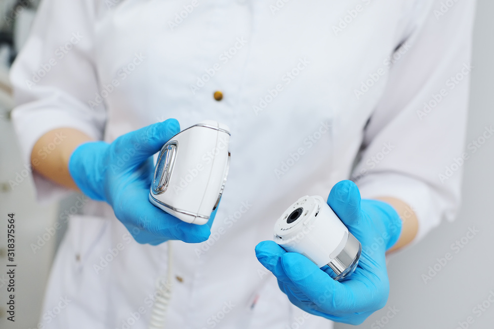 the cosmetologist holds a device for computer diagnostics of the structure and condition of the hair - a trichoscope.Preparation for the trichoscopy procedure.