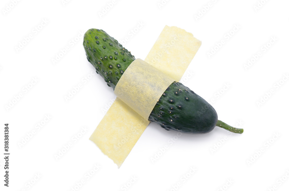 Cucumber glued with yellow tape to a white surface. Modern pop-art.