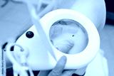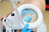 doctor dermatologist-a young woman examines the skin condition of a male patient-moles, scars, pigmentation through a special device-a cosmetic lamp magnifying glass.