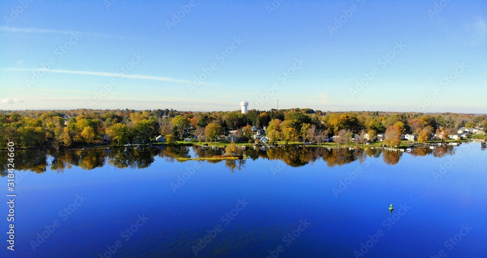 The aerial view of the waterfront homes by Oneida Lake with stunning fall foliage at Syracuse, New York, U.S.A
