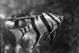 Old Wife (Enoplosus armatus) A black and white striped fish with a small head and long fins on top.
