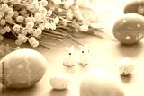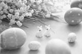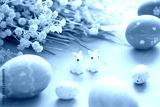 Easter eggs decoration with flowers on blue wooden table