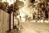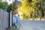 Teen girl with vintage wood gate at long road .