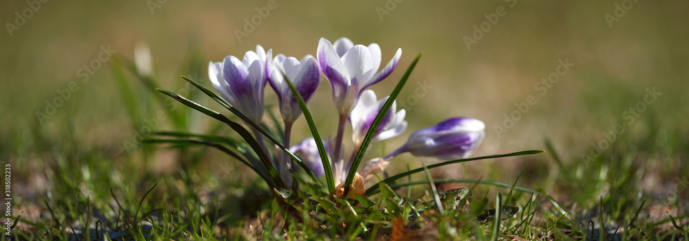 Purple crocuses bloom in the garden in April under the sun, the first spring flower. Beautiful design template for greeting card for Easter.
