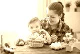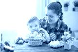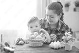 Happy time while painting easter eggs. Easter concept. Happy mother and her cute child getting ready for Easter by painting the eggs