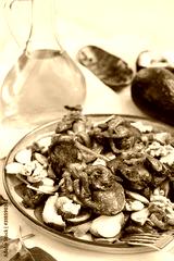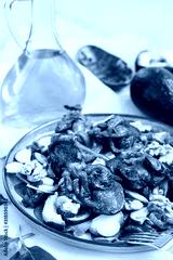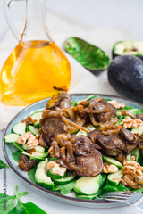 Salad with chicken liver, spinach, cucumbers, avocado and walnuts.