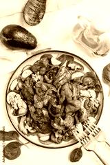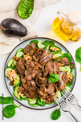 Salad with chicken liver, spinach, cucumbers, avocado and walnuts. Vertical image.
