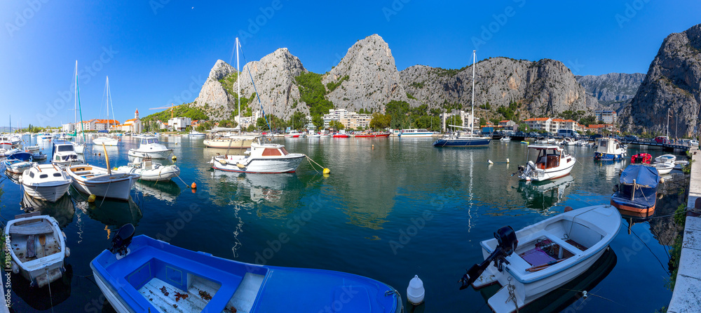 Omis. Panorama of the old fishing harbor on a sunny day.