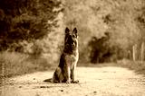portrait of beautiful young long haired female german shepherd dog sitting on the road in daytime in autumn