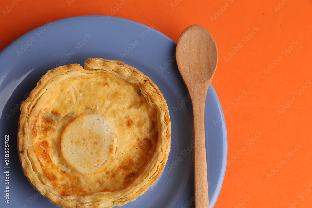 Delicious three cheese quiche in colored background