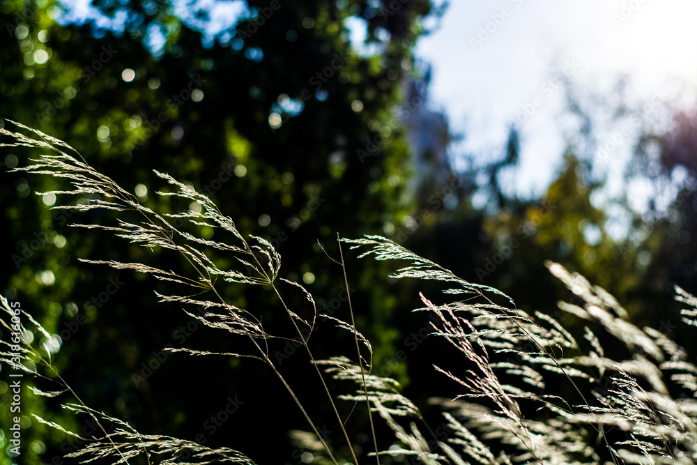 Background or texture of thin golden and green spikelets in grass under suns rays.