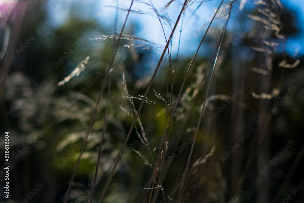 Background or texture of thin golden and green spikelets in grass under suns rays.
