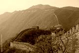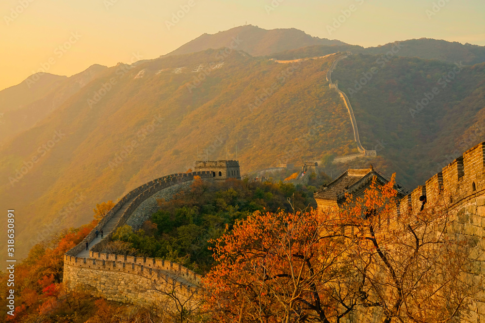 AERIAL: Breathtaking autumn colored woods surround the Great Wall at sunset.