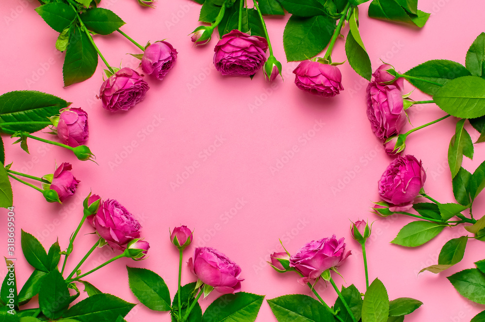 Flat lay flowers composition. Frame made of pink rose flowers on pink background top view copy space. Greeting card for Birthday, Womens or Mothers Day, March 8, Valentine's Day, wedding