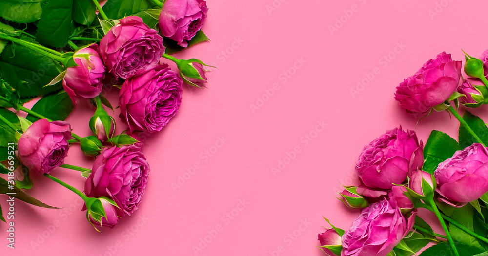 Flat lay flowers composition. Frame made of pink rose flowers on pink background top view copy space. Greeting card for Birthday, Womens or Mothers Day, March 8, Valentine's Day, wedding