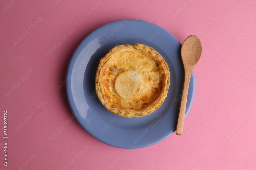 Delicious three cheese quiche in colored background