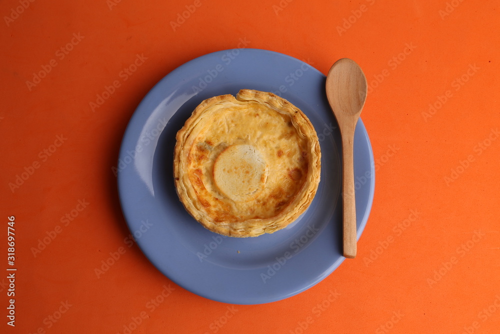 Delicious three cheese quiche in colored background