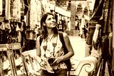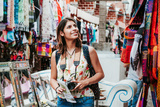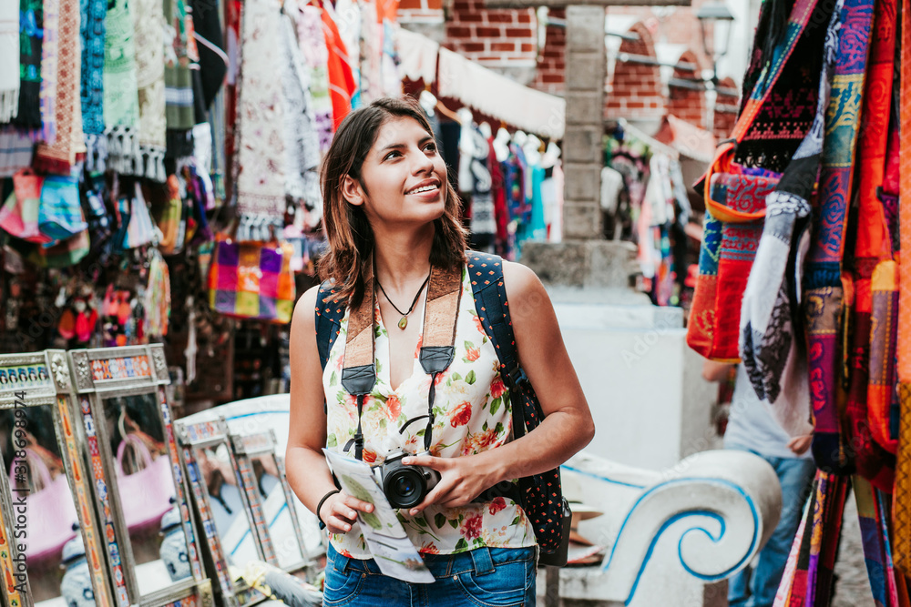 hispanic woman backpacker holding a map and camera in a traditional mexican Market in Mexico, Vacations