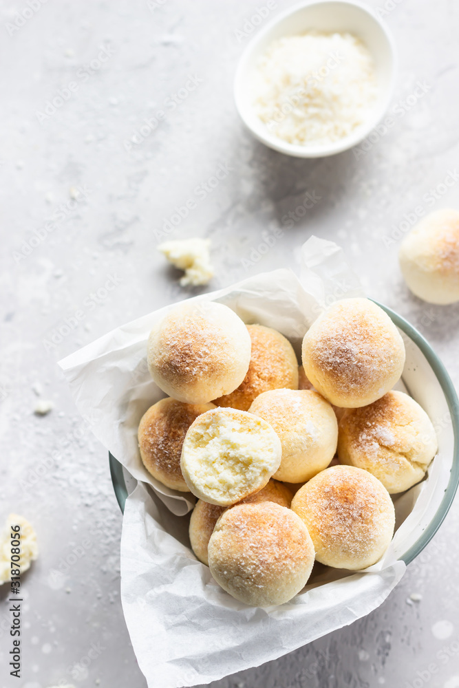 Sweet coconut cookies on a white plate, light grey concrete background. Coconut macaroon.